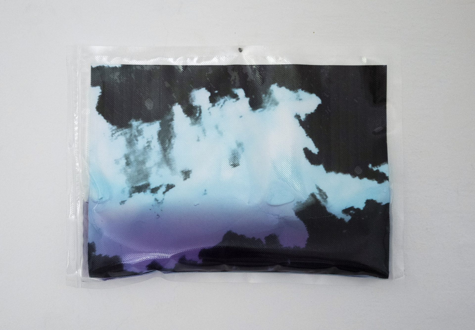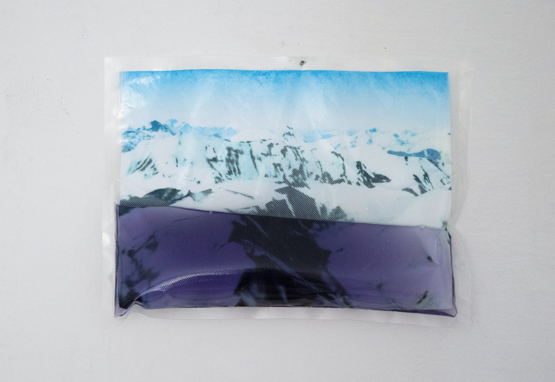 Once printed on paper, the photographs are placed in sealed plastic pouches filled with water. Over time, this process causes a slow dissolution of the image: colors begin to bleed, staining the liquid and fading from the paper.