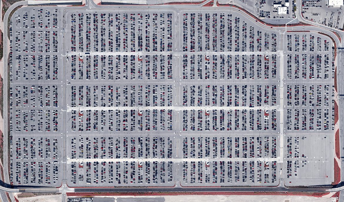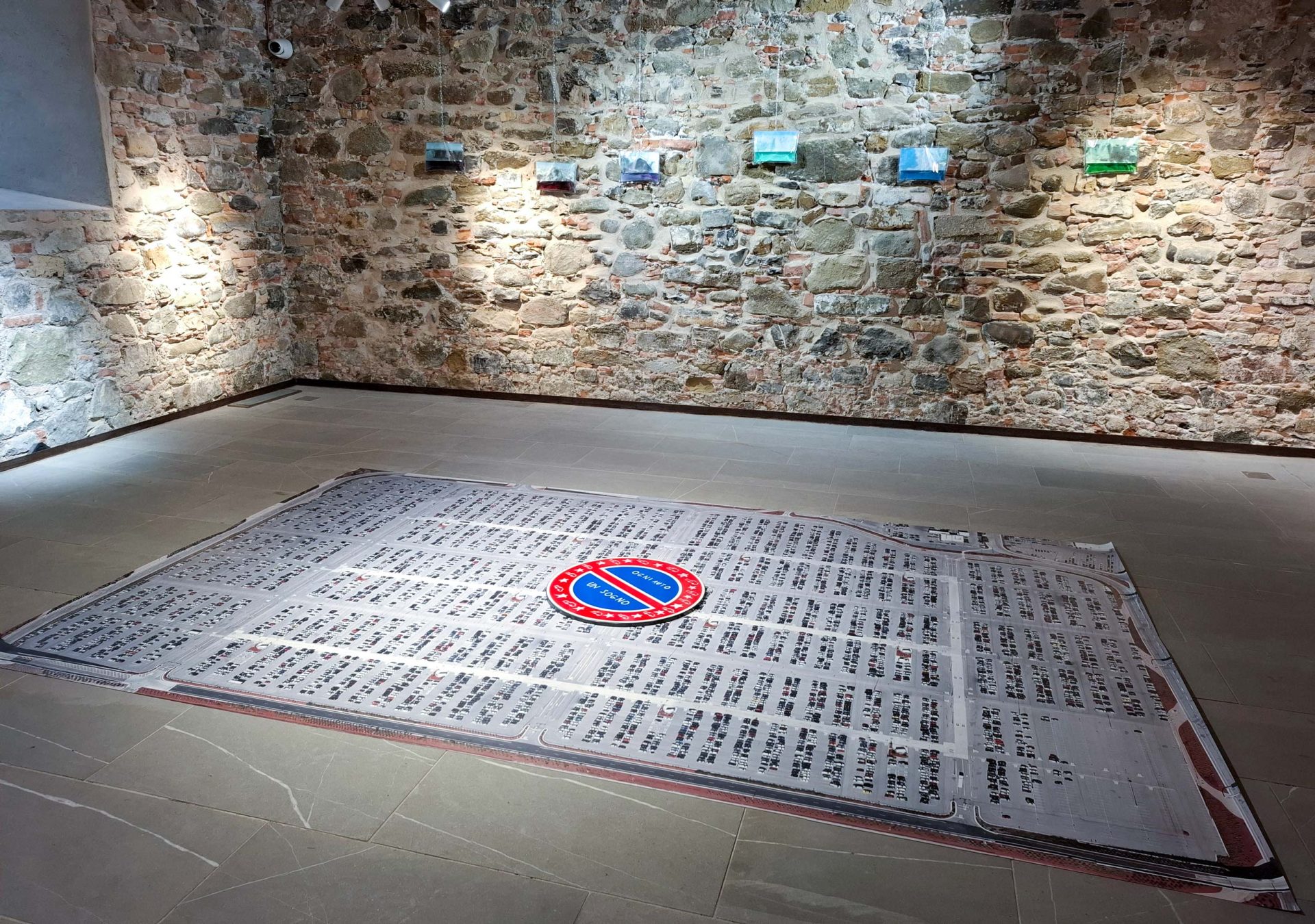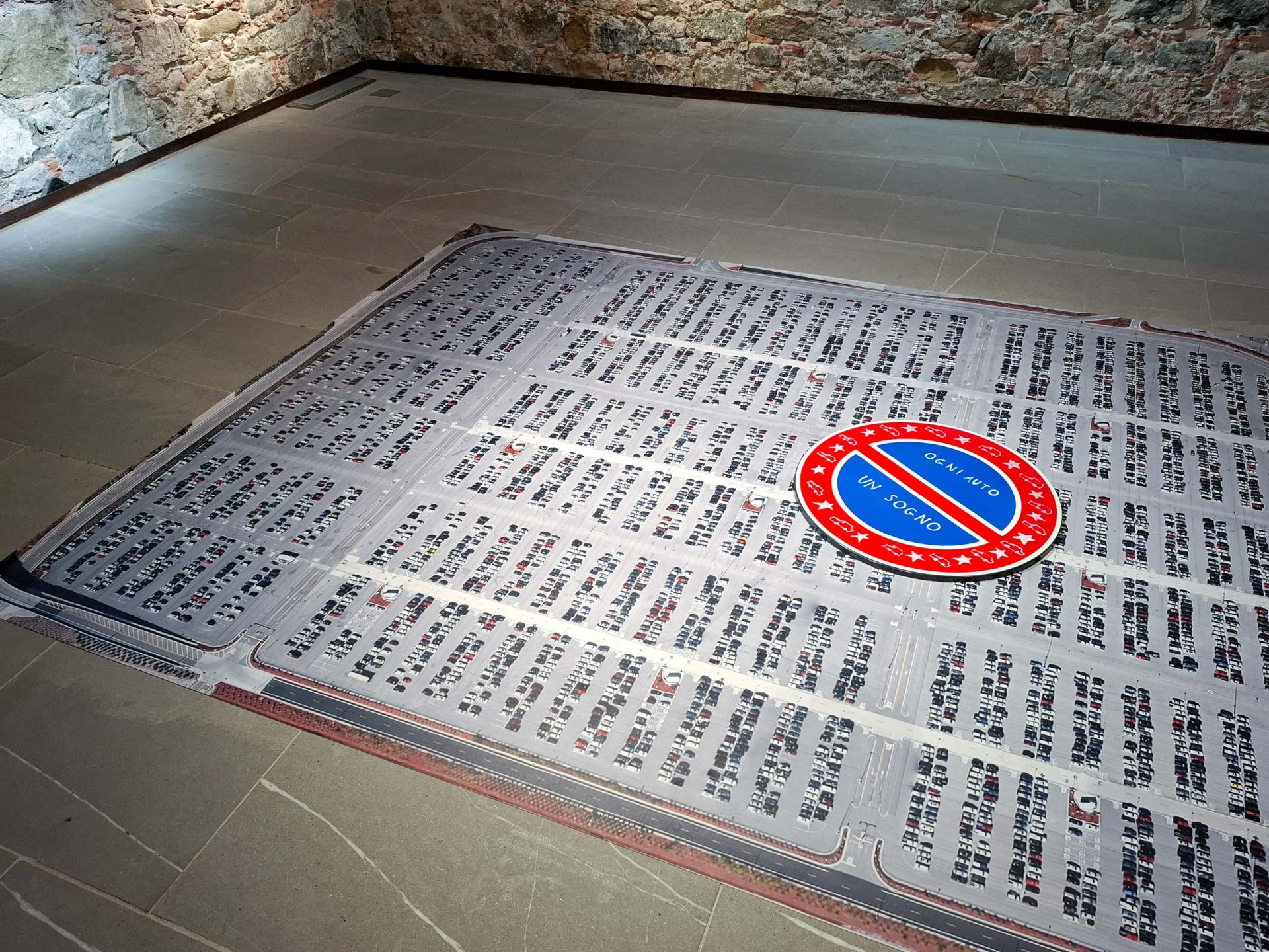 “My SUV weighs more than your doubts” begins from a Google Maps satellite image: an urban parking lot seen from above. A real, ordinary scene, enlarged until it becomes an installed landscape. The photograph, precise and impersonal, is placed on the ground and forces the audience to walk around it along a fixed perimeter, with no possibility of crossing directly. The space is familiar, yet estranging: entire portions of the city devoted exclusively to immobile objects. The automobile, long an emblem of freedom and movement, appears here in its most common (yet rarely thematized) condition: immobility. The work thus becomes a kind of atlas of urban stasis, where the rational geometry of planning meets the aesthetics of inactivity. An iconography of the infinite parking lot, of absent presence, of bulk turned into normality. In the middle of the path, a road sign laid on the ground adds an ironic touch, reminding us of the unresolved tension between the individual desire for ownership and the collective costs that follow.
